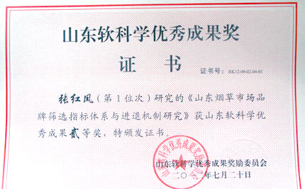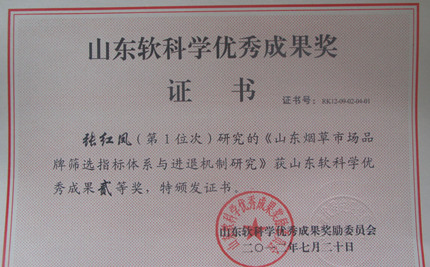 近日,2012年山东软科学优秀成果奖评审结果揭晓, 注册送彩金白菜张红凤教授主持完成的“山东烟草市场品牌筛选指标体系与进退机制研究”项目获山东软科学优秀成果奖二等奖。
