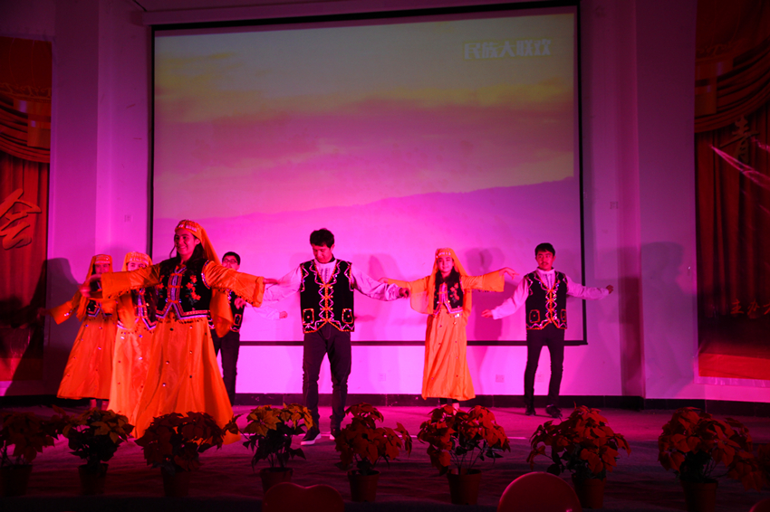 舞蹈《民族大联欢》,各少数民族舞者洋溢着灿烂的笑容,加上曼妙的舞姿,飘逸的长发,还有独具民族魅力的舞蹈动作,引得全场的阵阵喝彩。