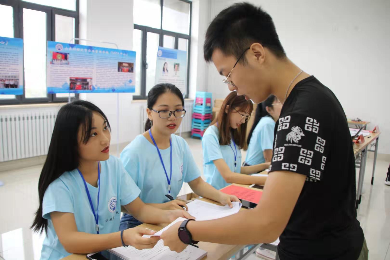 预迎新开始,新生陆续来到八号教学楼进行报到。14日下午至15日,正式迎新于圣井校区东南操场进行,新生报到量激增,迎新工作达到第一个高潮。尽管工作繁忙,志愿者们仍为每一位新生送上最灿烂的笑脸,热情地引导新生们办理每一项报道手续,耐心地回答学弟学妹们的每一个问题。