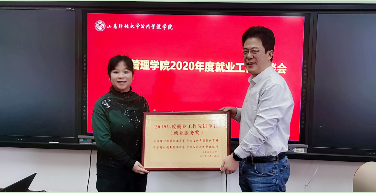 最后,就业指导处为学院颁发了“2019年度就业先进单位(就业服务奖)”奖牌,为李昭娜颁发了“2019年度就业先进个人”奖杯。