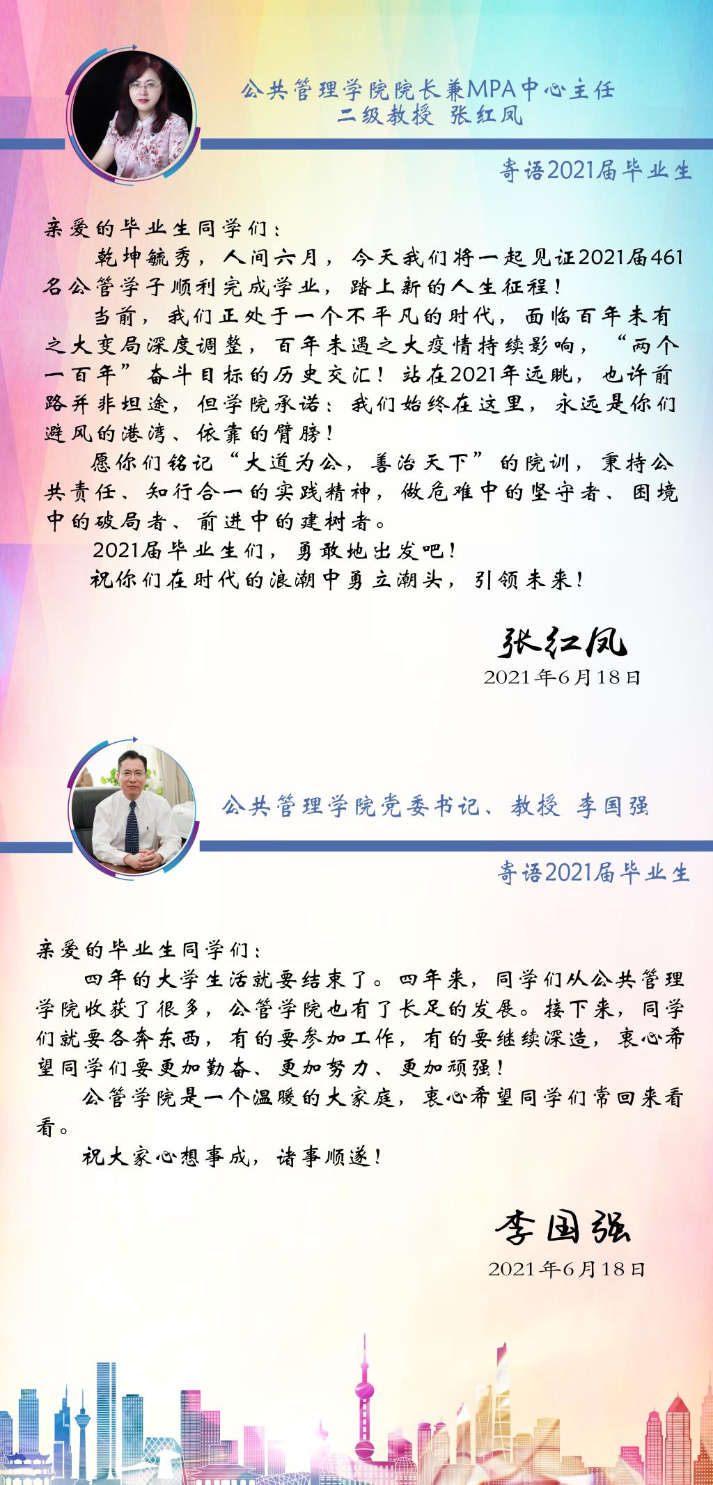 院长张红凤、院党委书记李国强寄语2021届毕业生