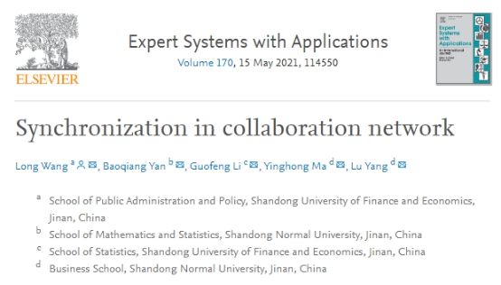教师王龙博士与统计学院李国锋教授等合作撰写的学术论文《Synchronization in collaboration network》于2021年5月15日发表在国际顶级期刊《Expert Systems With Applications》,出版于2021年第170卷。该期刊为我校特类期刊(SCI一区TOP,IF:6.954)。