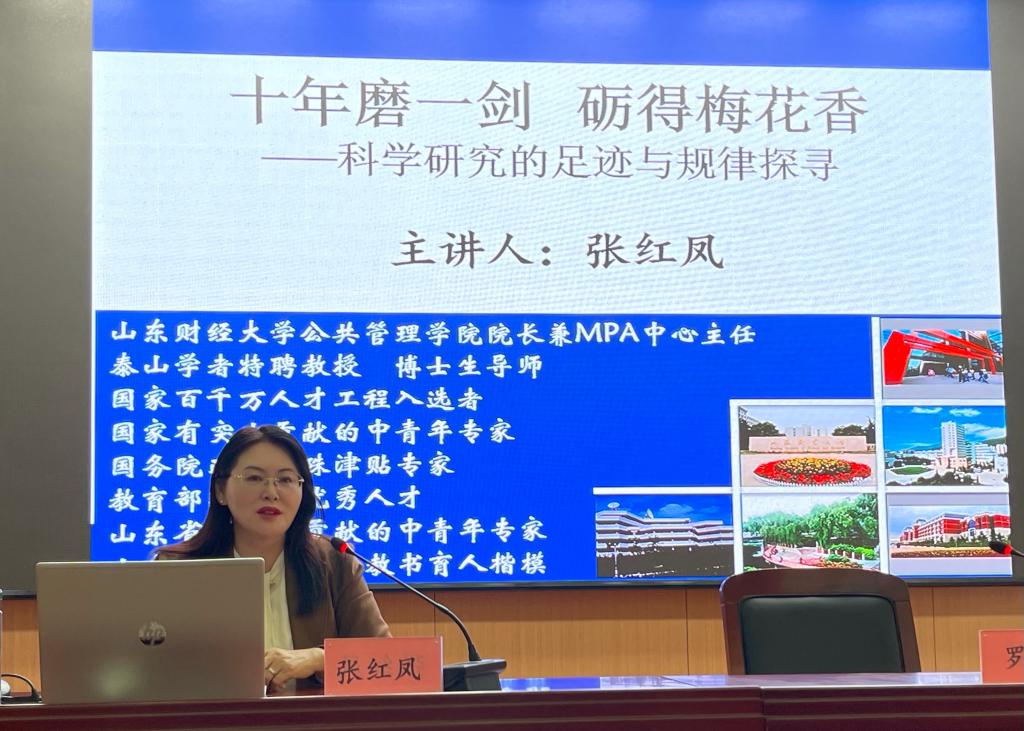 在科研论文方面,张红凤院长从自身的科研之路谈起,强调选题依据要与时俱进,选题内容新颖,视角独特,精准选题能起到事半功倍的效果,做到选题大小适中、题目凝练。随后,张红凤从站在巨人的肩膀上恰如其分地评价已有文献、分析该文献的启发和不足等方面,阐述了如何挖掘自身论文的价值。针对研究生论文如何创新,她强调了新理论、新方法、新体系、新规律、新研究视角的重要性,鼓励学生们开阔自己的研究视野。