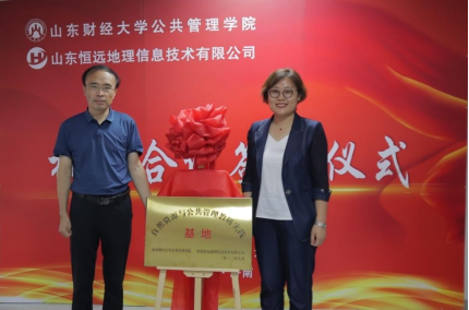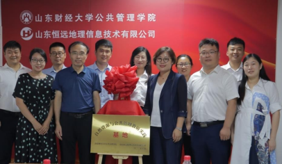 ·山东恒远地理信息技术有限公司“自然资源与公共管理教研实践基地”揭牌,双方代表合影留念。
