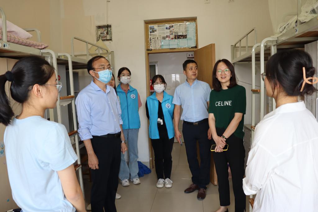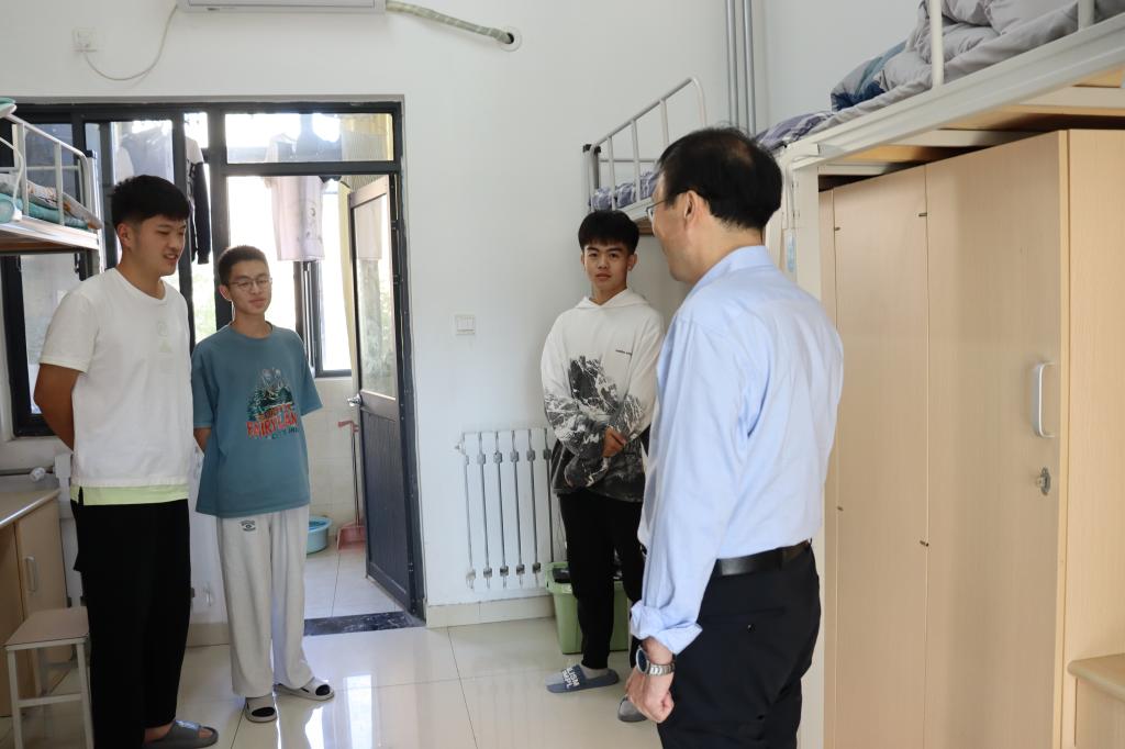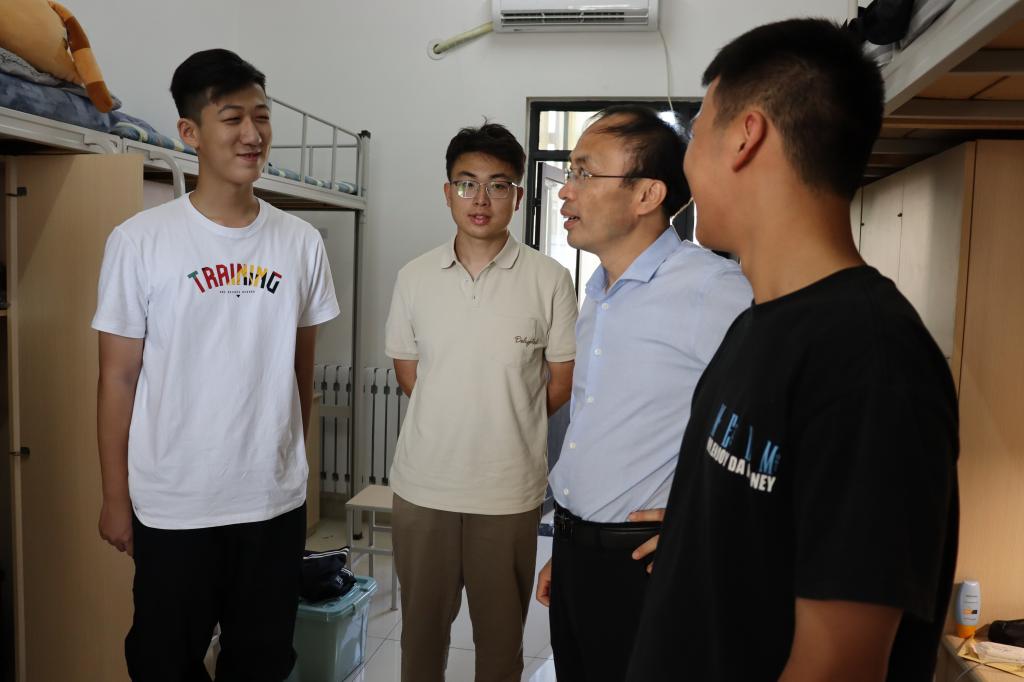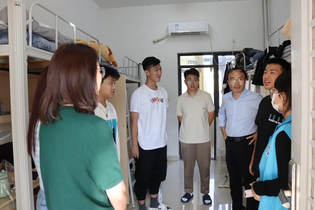 党委书记张建,党委副书记许薇,2021级辅导员张辉,2020级辅导员韩步彤和2022级辅导员张志斌来到新生宿舍,对大一新生表示慰问与关怀。