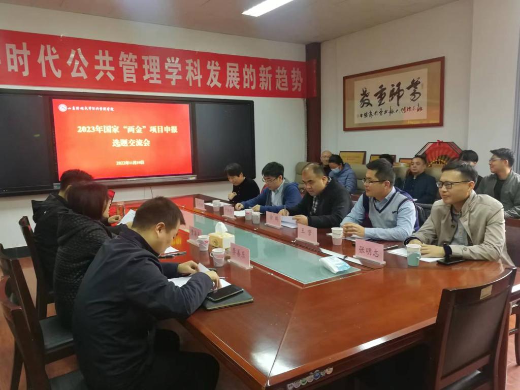 于11月10日在4308会议室举办了国家“两金”项目申报选题交流会。学院邀请徐鹏教授、王营教授、于新亮教授、杨志恒教授、张明志副教授做了申报经验分享和交流,院长贾海彦、副院长姜琪、李善乐及青年教师参加了会议。会议由副院长姜琪主持。