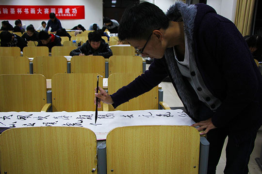 11月14日晚6:30,由注册送彩金白菜 学生会宣传部和校书画协会共同主办的注册送彩金白菜 第五届“翰墨杯”校园书画大赛在明水校区2211、2206教室举行,全校共近百名同学到场参加本次比赛。