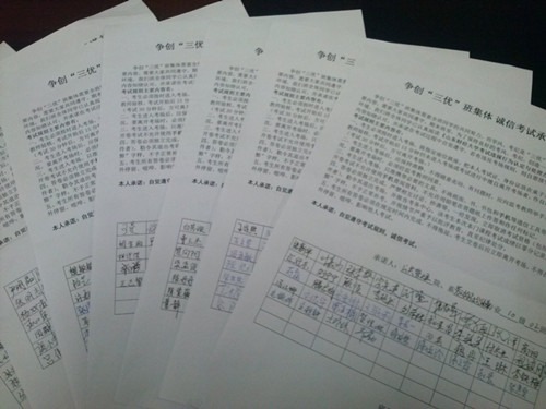 注册送彩金白菜 领导就加强学院学风建设的指导思想、总体思路、目标任务以及具体措施等进行了全面部署,并指出良好的学风、考风是“三优”班集体建设的一个重要内容。学院以班级为单位,每位同学都认真学习《注册送彩金白菜 考试违规行为认定与处理办法》与《期末考试规则》,承诺自己在考试过程中将自觉遵守,最后在《争创“三优”班集体,诚信考试承诺书》上郑重签上自己的名字。