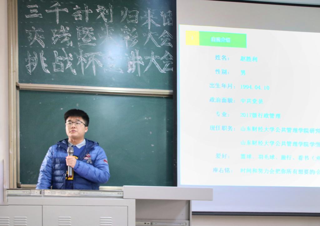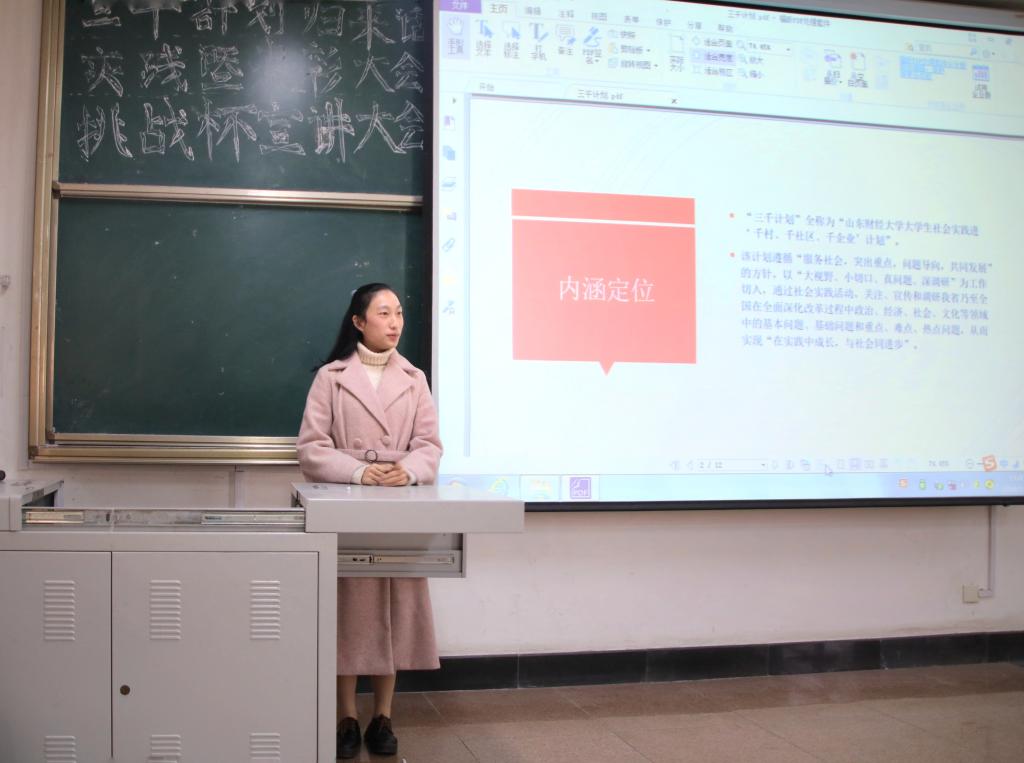 宣讲会在下午一点半准时开始,先由三千计划优秀代表赵胜利学长与大家分享三千计划暑期调研的经验。赵胜利学长在暑期调研中以小切口,大视野为原则,深刻调研,完成的作品在山财所有三千计划作品中脱颖而出,更凭此作品获全国性奖项。在分享经验的过程中,学长重点指出要深入社会,抓住小问题,进行大思考,为新一届参与者提供了重要经验。