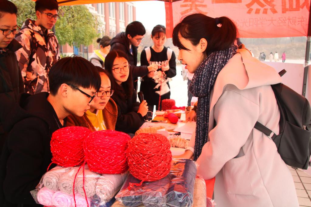 在路演活动现场,同学们积极参与,志愿者们热情引导,气氛十分热烈。志愿者们首先就活动目的和内容为前来参观的同学进行讲解说明,并鼓励他们进一步了解本次活动。现场准备好了粉色和白色的爱心卡片,以及收集爱心寄语的留言箱。许多同学纷纷领取纸笔,认真构思并写下暖心激励的话语。一旁摆放着粉白与朱红色的毛线,旁边两位志愿者手拿针线,对前来学习的同学进行现场针织教学。志愿者手中针线翻飞,柔暖舒适的毛线帽已见雏形。