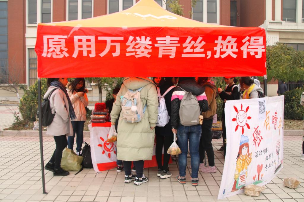 随后一段时间,志愿者同加入活动的同学一同加班加点赶制毛线帽,并收集青丝数份以及近百张爱心寄语笺。12月16日,阳光365协会在明水校区学生餐厅二楼进行毛线帽捐赠活动。参与本次活动的同学悉数到来,并将亲手编织的毛线帽交予志愿者。阳光365志愿者协会下设的公益项目组癌love成员将所募集爱心物资悉数捐赠于癌友公益,并在癌友公益的帮助下转赠予有需要的癌症患者。