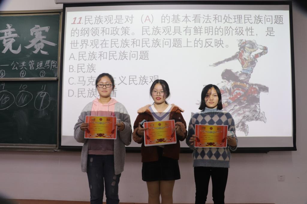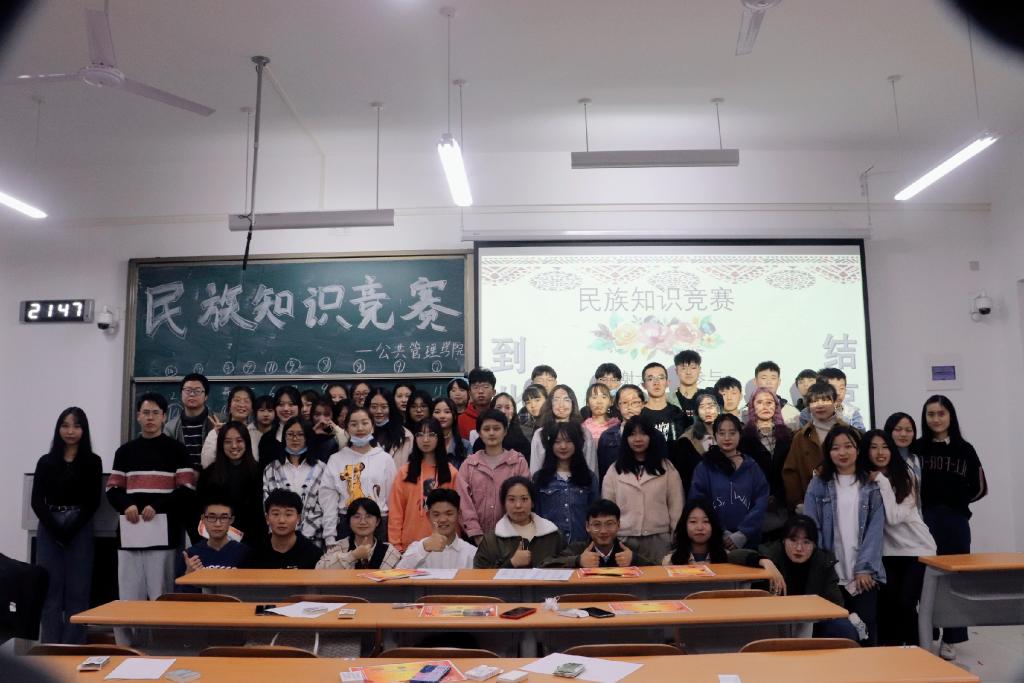 复赛分两个环节进行。第一环节,每组派出一名代表参与“踩气球”游戏,抢夺复赛第二环节的“免扣分卡”,现场气氛十分活跃,台上台下欢声笑语不断。第二环节分两轮进行,第一轮采用记分制,参赛队在规定时间内轮流答题,共120道题,采用黑板正字计分。各队集思广益、团结协作,大声喊出自己心中的答案,彰显了公管学子的自信风采,台下更是掌声雷动,将比赛气氛推向高潮;第二轮采用扣分制,以抢答方式进行。比赛立即进入白热化阶段,由于抢答环节各组成员竞争激烈,难于统计,主办方临时调整比赛规则,改为和第一轮相同的轮流作答方式,但同学们依旧热情不减,积极答题。最终行政管理2019级1班、劳动与社会保障2018级1班以及行政管理2019级2班的同学,他们凭借丰富的知识储备、默契的配合以及稳中求胜的策略突出重围,获得了一等奖,领到了民族事务发展部颁发的奖品,其他入围队伍获得了优秀奖。比赛结束后所有参赛人员和工作人员拍照留念。