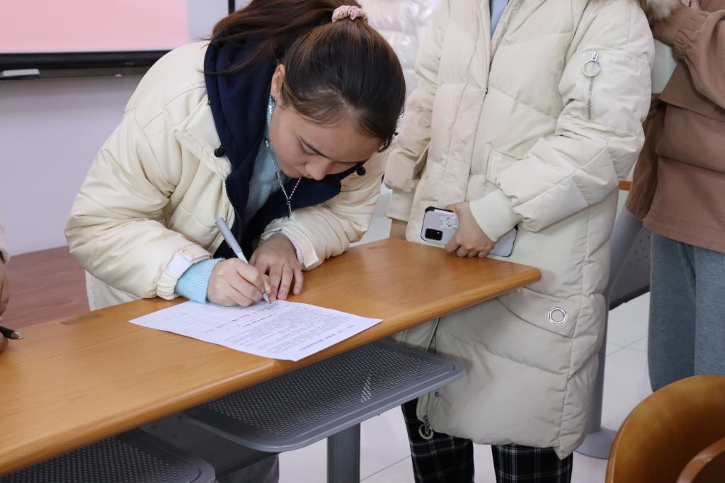 最后,全体学生签署考试承诺书,会议到此结束。希望全体学生在期末考试中端正考风,严肃考纪,向学校交上一份诚实的答卷,也为己过往的一年交上一份满意的答卷!