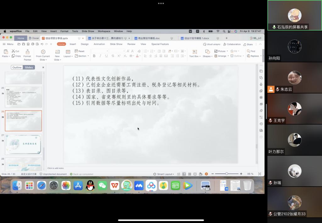 首先,石泓辰通过详尽丰富的PPT向我们分享了商创相关经验,从选择项目、实践项目、打磨项目、获得信息这四个方面,讲述了如何进行一场完整的创业比赛。其中详细介绍了第三部分,即如何打磨项目。她着重强调了互联网+、挑战杯、三创赛及各类商创项目创业计划书的“史诗级”通用模板,同时从执行概要、项目背景、产品技术与服务、市场分析、营销策略、公司管理、融资分析、财务分析、风险分析与控制、风险资本的退出这十个方面详细讲解了打磨项目的规范方法,给各位同学指明了一条清晰的创业路线。