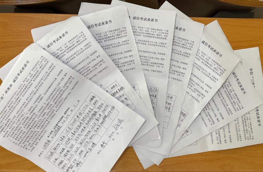 学子要严肃考风考纪,诚信考试。随后各班组织学生有序签诚信考试承诺书,并提醒同学要积极复习,诚信考试,严禁作弊舞弊等行为发生。期末在即,同学们要合理安排复习时间,利用碎片化时间,针对不同学科进行不同的复习时间分配。在复习周要调整好考试心态,保证作息规律,饮食规律,以最轻松之姿去应对期末考试。在考试过程中每位考生要遵守考场纪律,服从监考老师的管理,诚信考试,不作弊、不帮助他人作弊,做到实事求是,诚信考试。