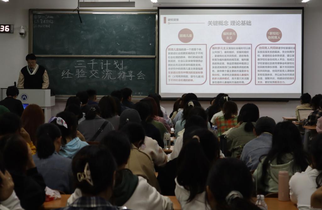 (通讯员 李星玥 杨政利 摄影 王步霓 刘珂瑜 何叶)为了让学院新生更好地了解“三千计划”社会实践活动,提升社会实践调研与撰写报告经验,10月30日晚,学院于圣井校区8-112教室召开了“三千计划”经验交流分享会。此次活动由学院实践创新部组织,三支重大团队分享,2023级全体同学参加。