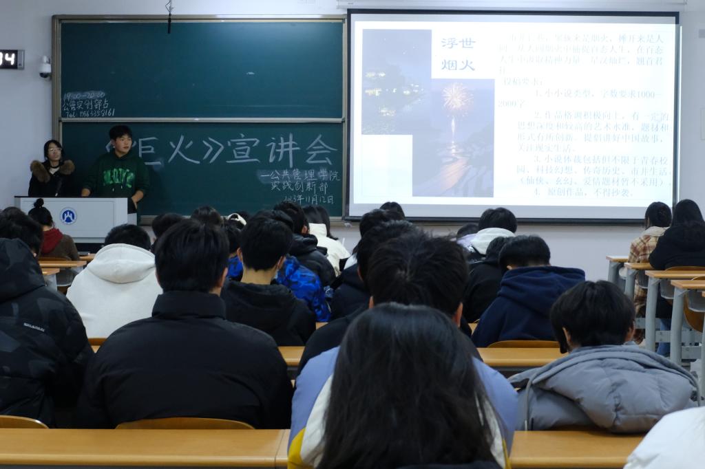 (通讯员 杨政利 摄影 何叶)为加强校园文化建设,彰显公管学院文化特色,提升学院的文化软实力,迎合传统专业特色,打造以学科专业为基础的公管学院文化平台,11月12日下午,学院院刊《炬火》宣讲会于圣井校区8102教室顺利召开。本次宣讲会由学院实践创新部主持,2023级全体新生参加。