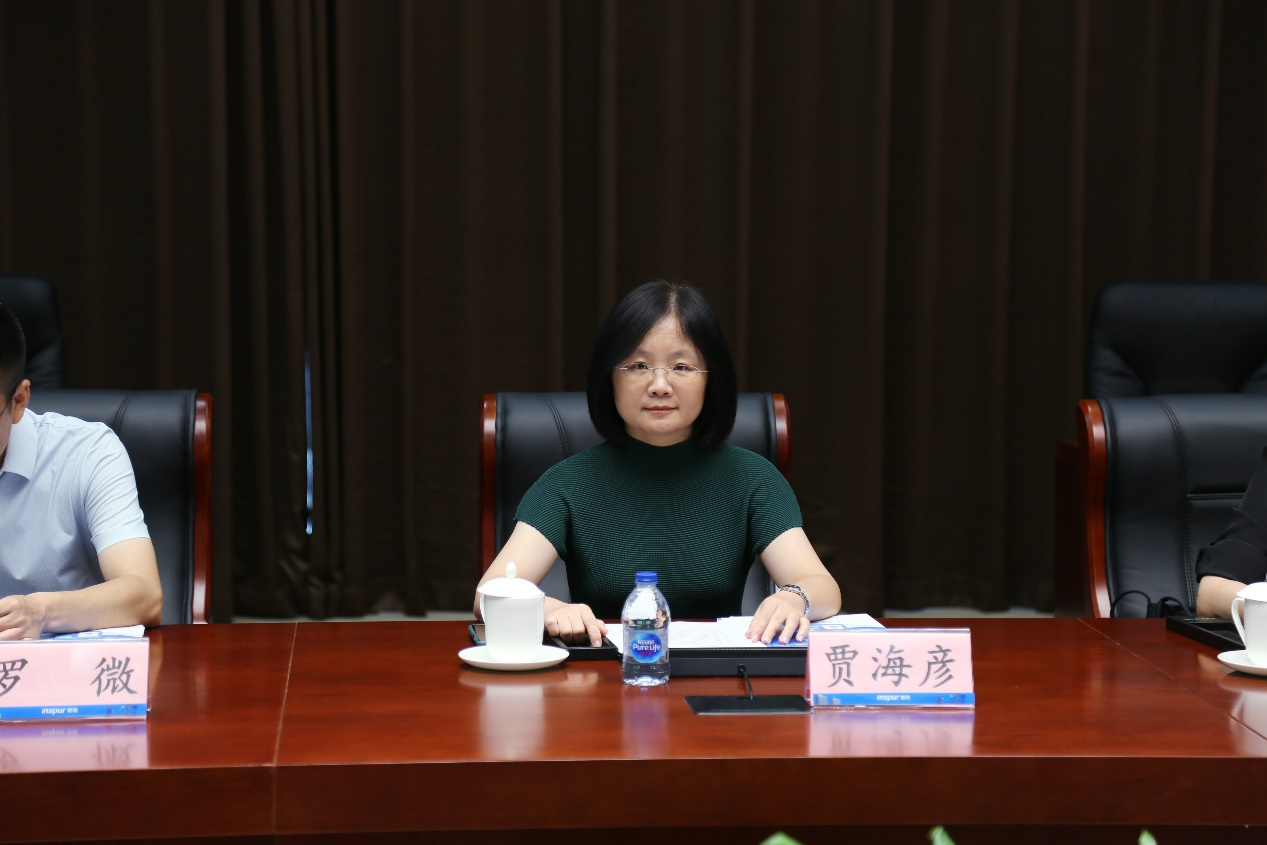 贾海彦首先对张帆的热情接待表示感谢,高度赞扬了浪潮在大数据研究与应用、数字化转型等方面取得的丰硕成果,并从历史沿革、学科建设、师资队伍、人才培养、科学研究、社会服务、科研平台等方面介绍了学院发展情况。她表示三方可结合公共治理数字化现代化建设的战略需求,依托“公共管理大数据研究与实践基地”,建立产学研深度融合的一体化校企合作平台,共同推进在人才培养、专业建设、教学科研等方面的全面合作。