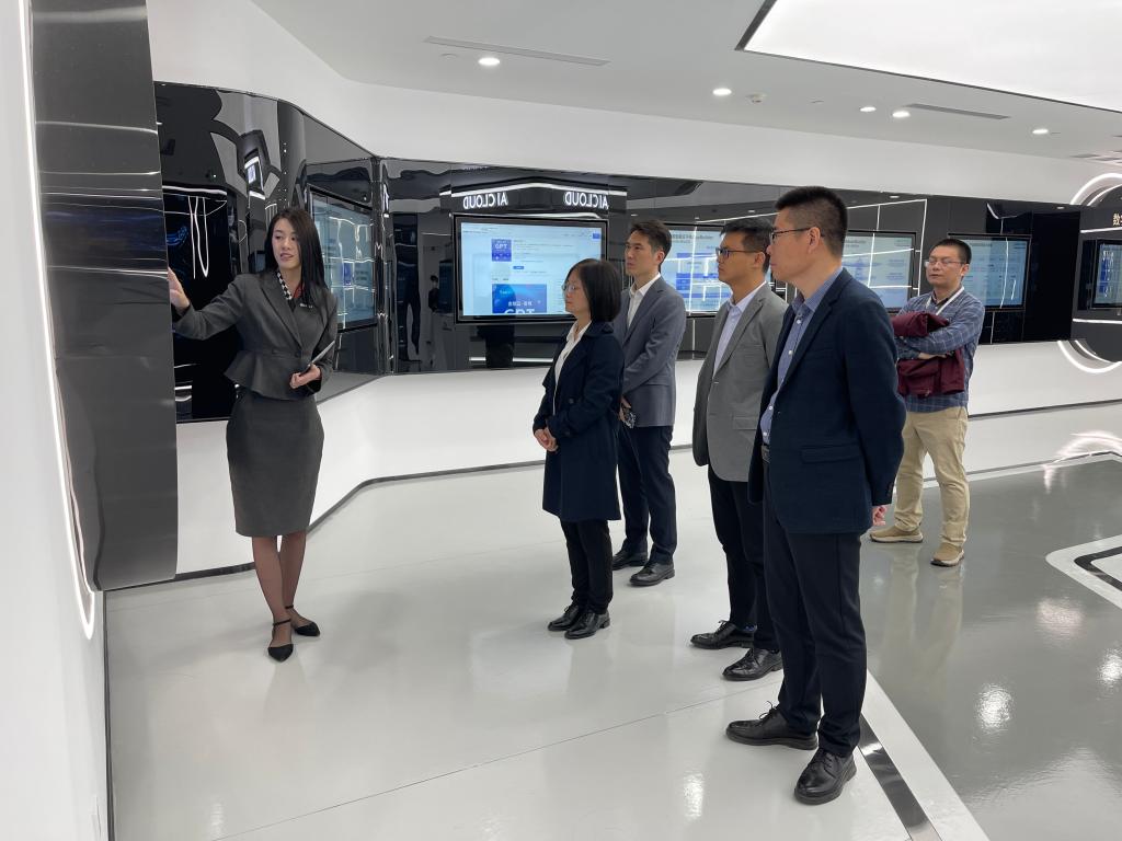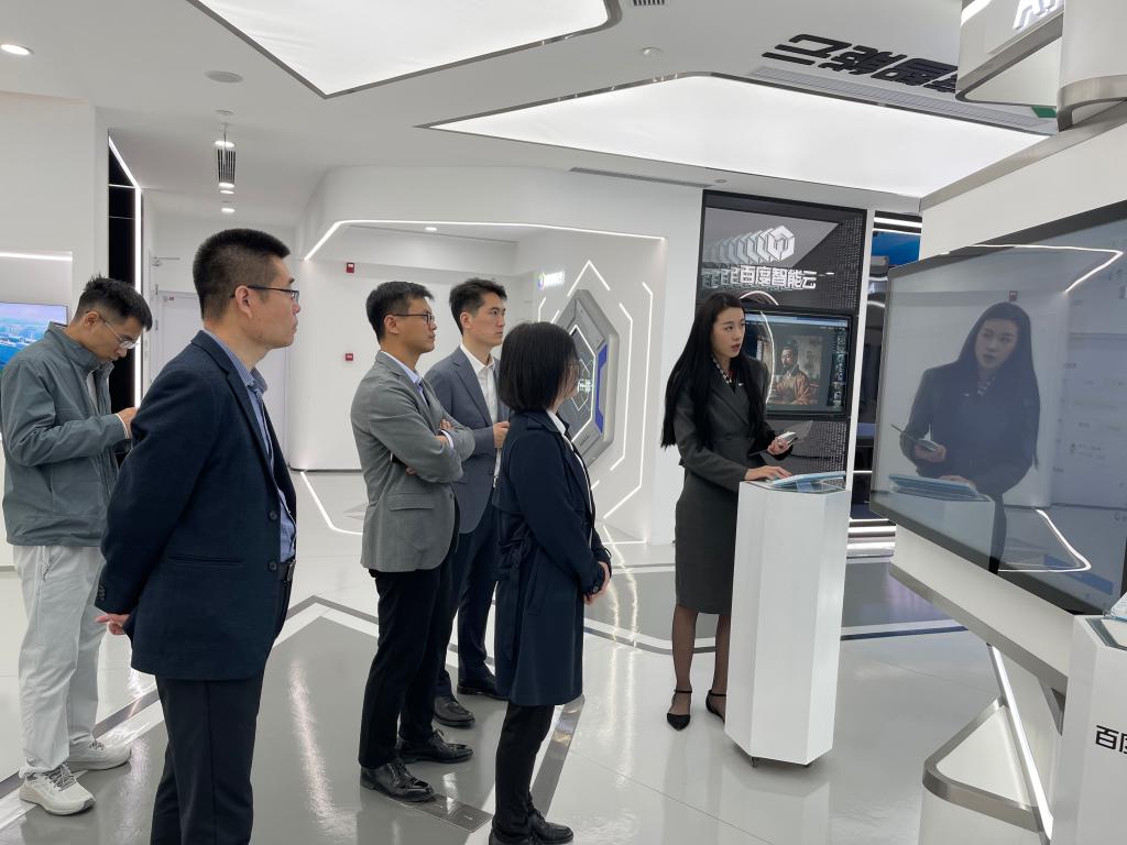 贾海彦一行在专业讲解员的带领下参观了百度公司展厅,从时间长廊、核心技术展区和专利展区三个方面对百度公司进行了全方位、细致的了解。在时间长廊处,讲解员介绍了百度的整体发展历程和目前重点发展的“文心大模型”;在核心技术展区,讲解员展示了一些数据中心内部使用的具体硬件设备,并针对个别产品提供了体验活动。