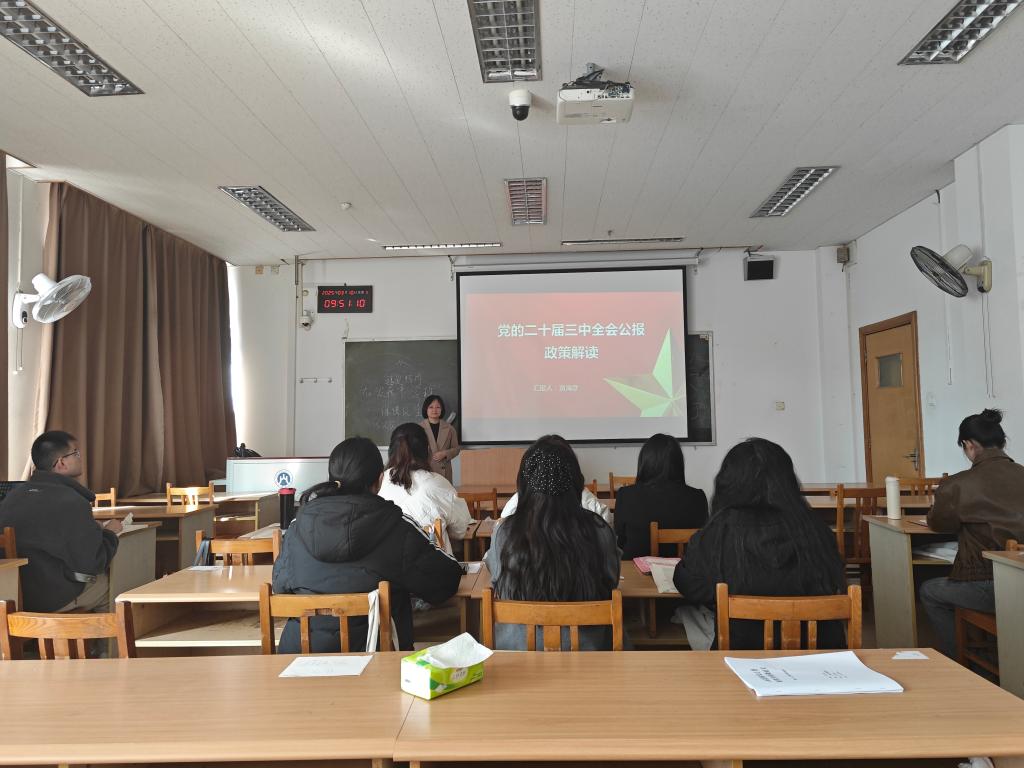 贾海彦结合公共管理学学科特色和人才培养目标,从三个维度系统解读全会精神。首先,深入阐释了党的二十届三中全会的历史方位与战略意义,强调全会通过的《中共中央关于进一步全面深化改革、推进中国式现代化的决定》是新时代改革的“路线图”,特别是“六个坚持”重大原则为高等教育领域深化改革提供了根本遵循。在第二部分,贾海彦结合学院发展实际,重点剖析了全会提出的“推进教育现代化”“完善科技创新体系”等部署对公共管理高层次人才培养的启示。