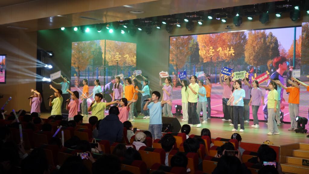 观众席间,全体新生深受感染、热情高涨,共同挥舞荧光棒,跟随音乐,放声合唱。