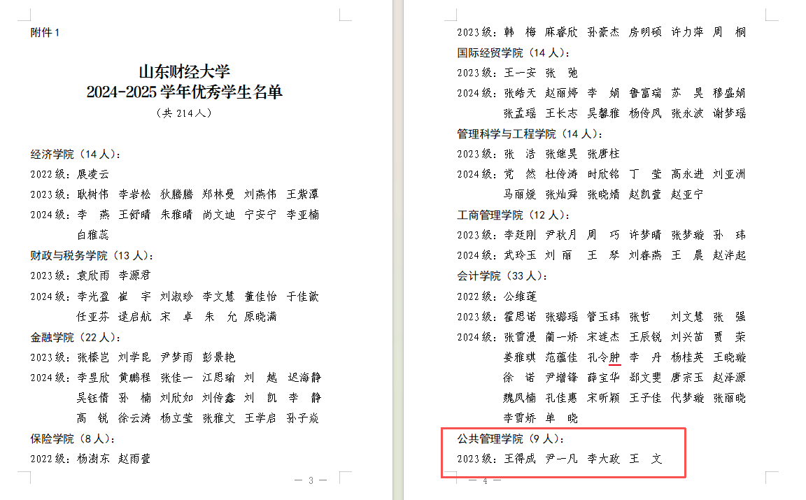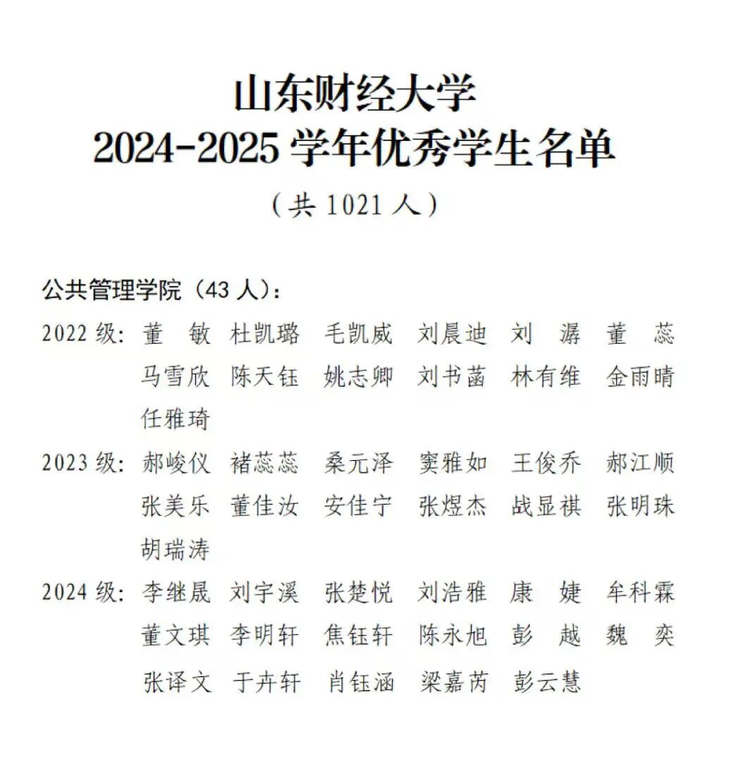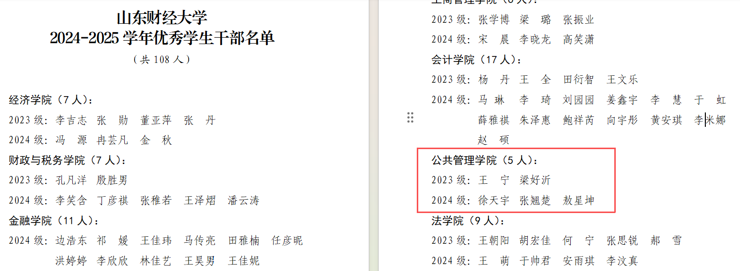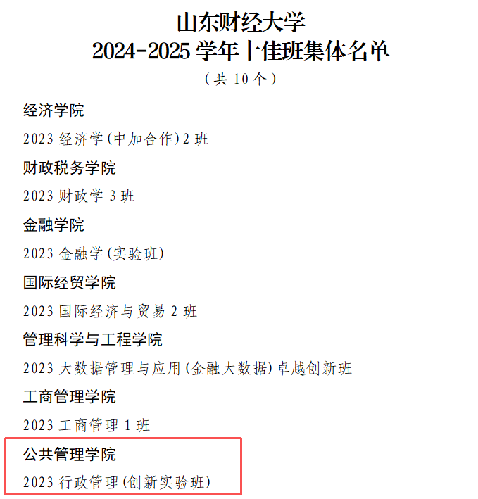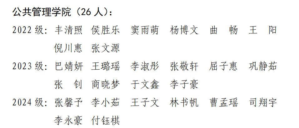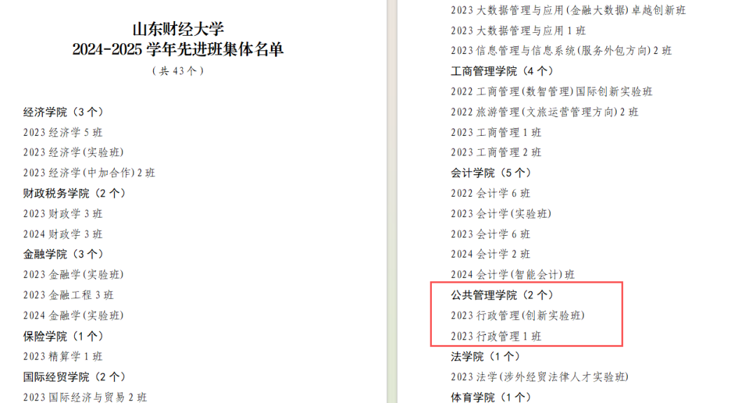 2023行政管理创新实验班获评“十佳班集体”和“先进班集体”称号,2023行政管理1班获评“先进班集体”。董敏、郝峻仪、李继晟等43名本科生获评校级“优秀学生”,丰清照、巴婧妍、张馨予等26名本科生获评校级“优秀学生干部”。