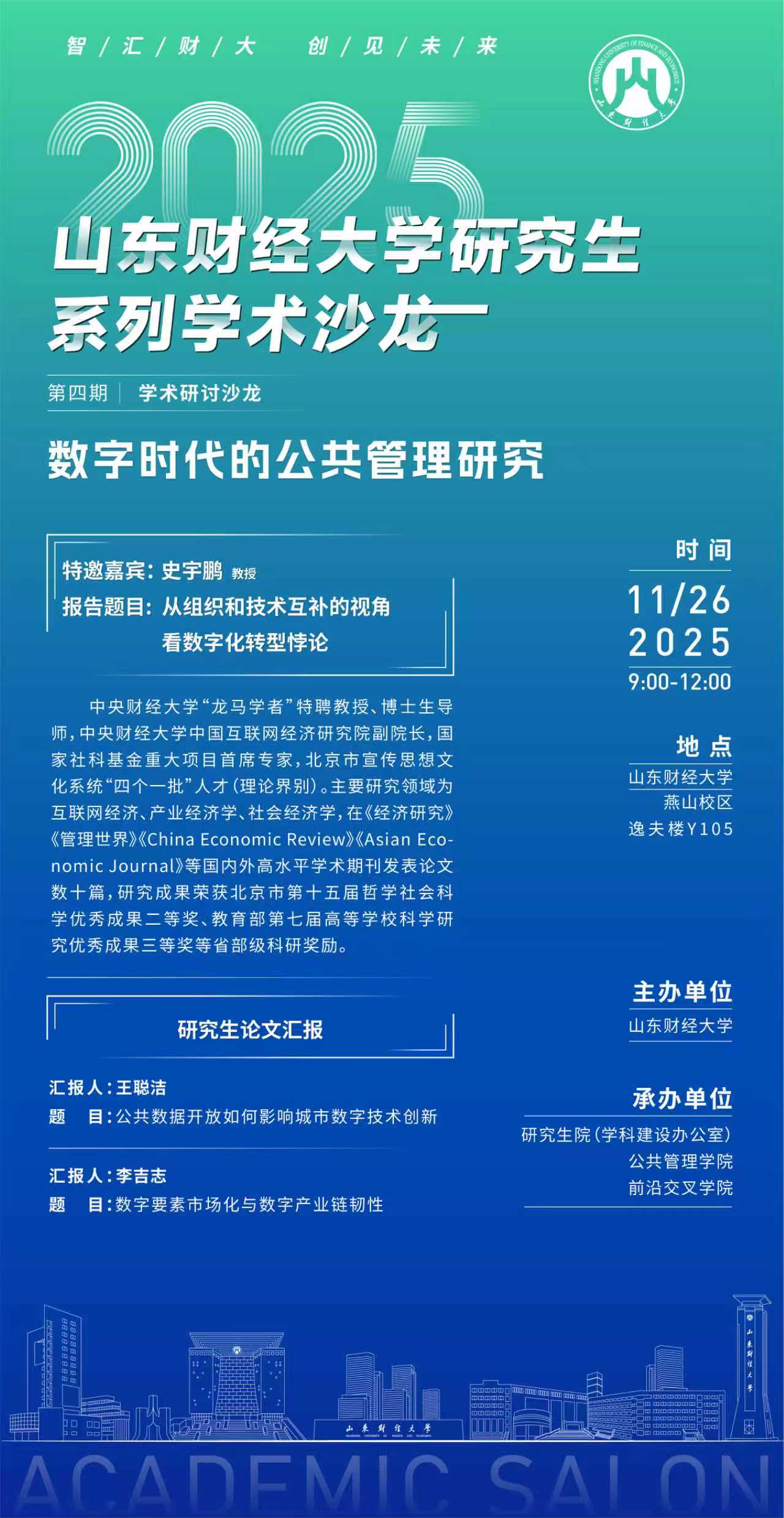 研究生系列学术沙龙第四期将于11月26日上午举办!沙龙特邀中央财经大学史宇鹏教授与师生聚焦时代热点,共话学术前沿,激发创新思维,诚邀全校师生共赴这场学术盛宴!