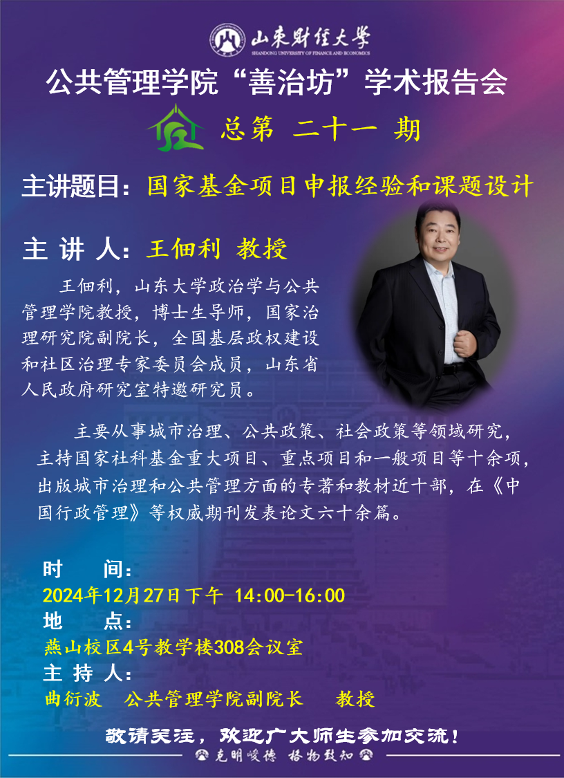 注册送彩金白菜 “善治坊”学术报告会第二十一期主讲题目:国家基金项目申报经验和课题设计
