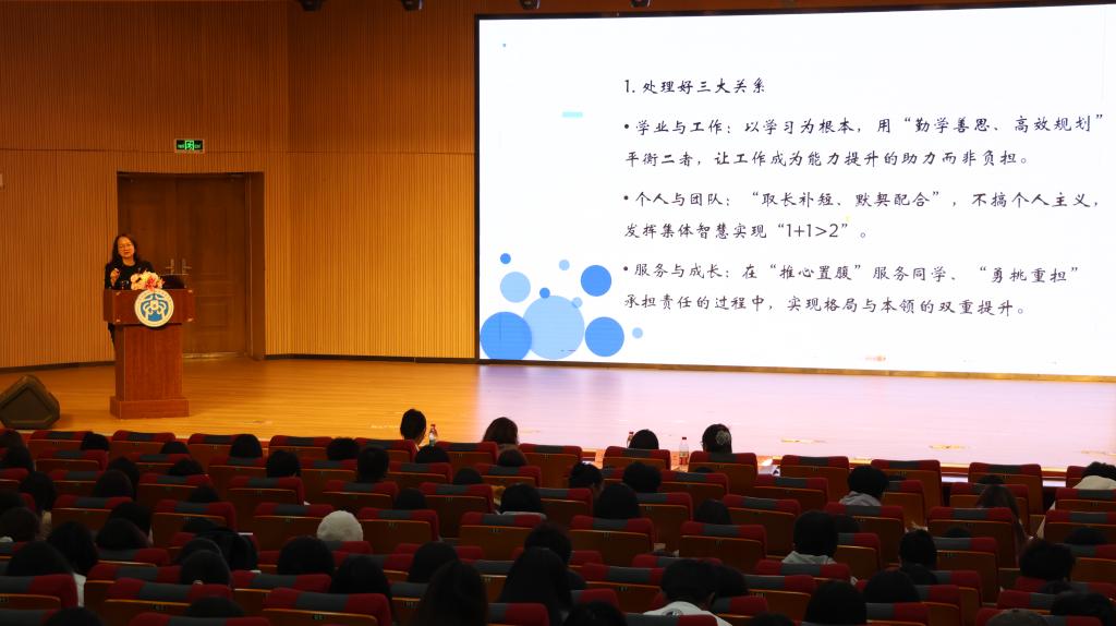 在文体中心报告厅成功举办学生干部培训活动。学院党委副书记许薇担任主讲,第十四届学生会全体成员及第一届大学生事务发展中心全体成员参与培训。